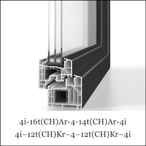Verwendet wird dreifache Isolierverglasung (zwei Scheibenzwischenräume, Edelgasfüllung). Die Außenscheiben besitzen auf den zum Zwischenraum gerichteten Flächen eine Low-E-Beschichtung zur Reduktion des Wärmeverlusts. Als Warme-Kante-Abstandhalter kommen TGI Spacer (Technoform, DE) oder Chromatech (Rolltech, DE) zum Einsatz. Für Argon sind Scheibenzwischenräume von ca. 14–16 mm energetisch optimal (niedriges Ug); asymmetrische Kammerbreiten verbessern zusätzlich den Schallschutz. Typische Ug-Werte solcher Aufbauten liegen je nach Glasaufbau bei ca. 0,5–0,6 W/(m²·K). Zur weiteren Steigerung der Wärmedämmung können Krypton-Pakete mit ca. 10–12 mm Zwischenräumen eingesetzt werden; damit sind Ug ≈ 0,4–0,5 W/(m²·K) erreichbar. Optional ist eine Solar-/SunControl-Beschichtung der Außenscheibe für den sommerlichen Wärmeschutz.